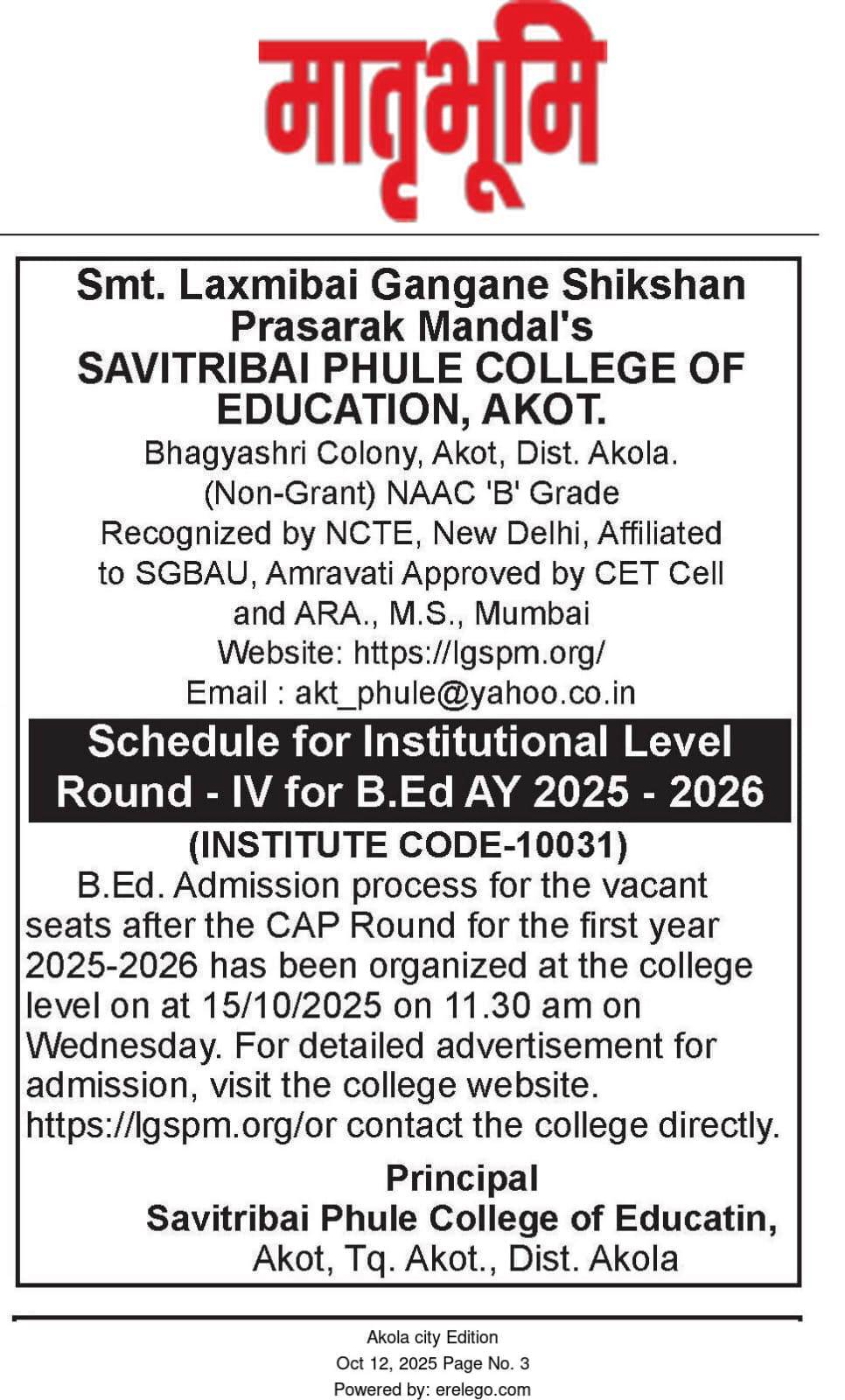 Savitribai Phule College of Education is one of the oldest college among the self financed college in the Amravaiti University. The college was established in the ear 1986 with a motto to “ Serve the people through Education”. College has played a vital role in the field of Teachers Education.